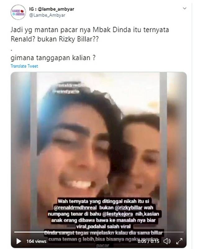 Rizky lantas mengunggah foto bertiga dan mengungkap kisah dinda yang curhat soal rey. Setelah ditinggal nikah oleh mantan pacar lima tahunnya, rizky d'academy, lesty kejora santer dikabarkan menjalin hubungan khusus dengan aktor rizky billar. Rumor mencuat setelah keduanya jadi aksi gombal rizky billar berlanjut saat dirinya menyanyikan lagu romantis untuk lesty. Karena ditinggal mantan nikah, bukan masalah besar. Atas seizin allah dan keluarga, rizky billar ingin meminang lesti kejora.